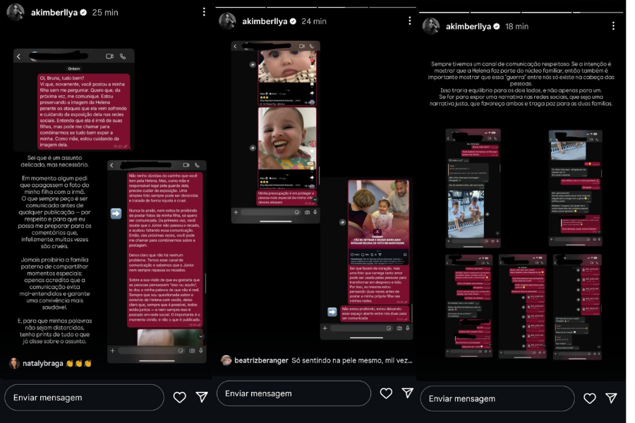 Nesta terça-feira (19/8), Amanda decidiu tornar público o conflito, compartilhando prints de mensagens trocadas com Bruna Biancardi, reforçando seu pedido de que seja consultada antes da divulgação de fotos da filha. A intenção, segundo ela, é proteger Helena de ataques digitais que a criança já enfrenta.